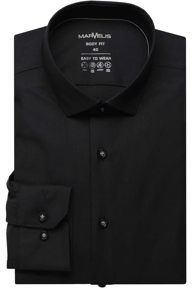 Das Marvelis Body Fit Hemd mit einem Modern Kentkragen, in der Farbe schwarz – Einfarbig. Das tailierte, körperbetonte Business-Hemd mit natürlichen Comfort Stretch für uneingeschränkt hohen Tragekomfort. Formbeständig und Pflegeleicht.
