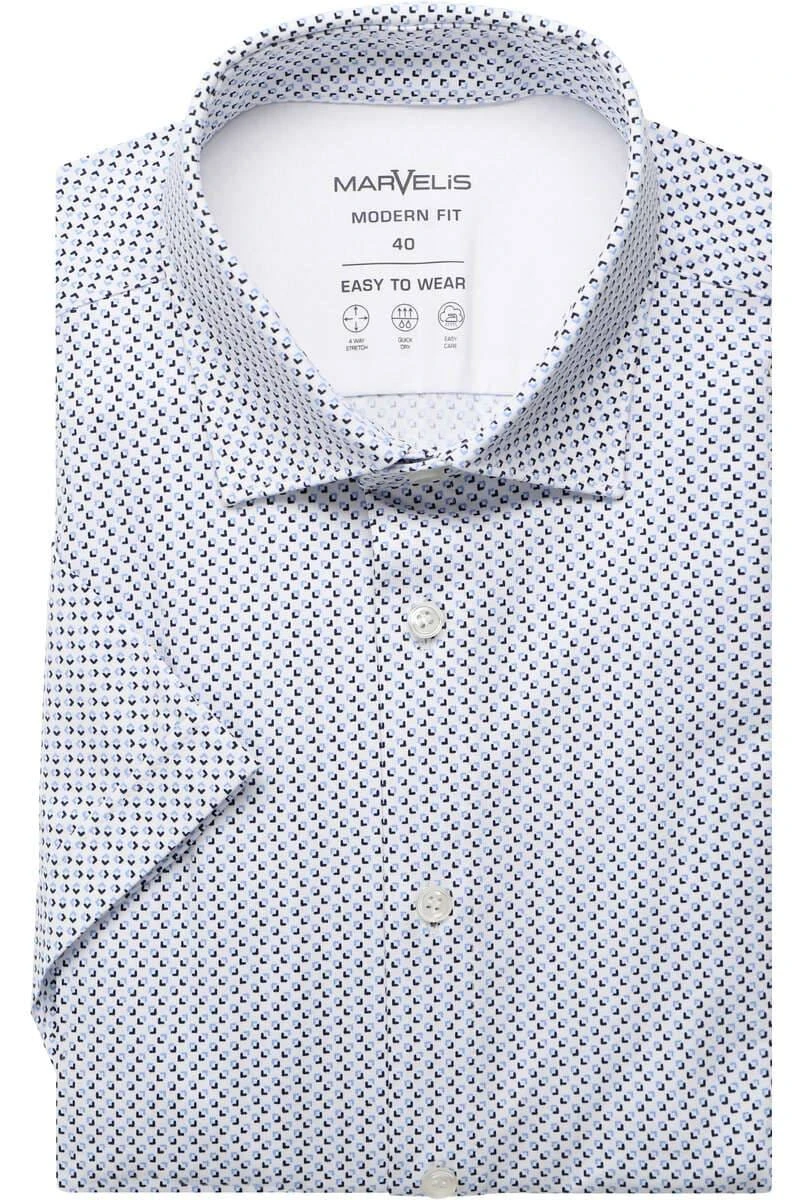 Das Marvelis Modern Fit (früher Marvelis Slim Fit), bügelfreie Hemd mit einem New Kentkragen, in der Farbe bleu – Gemustert. Es ist stets Pflegeleicht und ist für seine herausragende Trage- und Pflegeeigenschaften, kompromisslose Qualität sowie den höchsten Tragekomfort bekannt. Zudem geprüft nach Öko-Tex Standard 100.