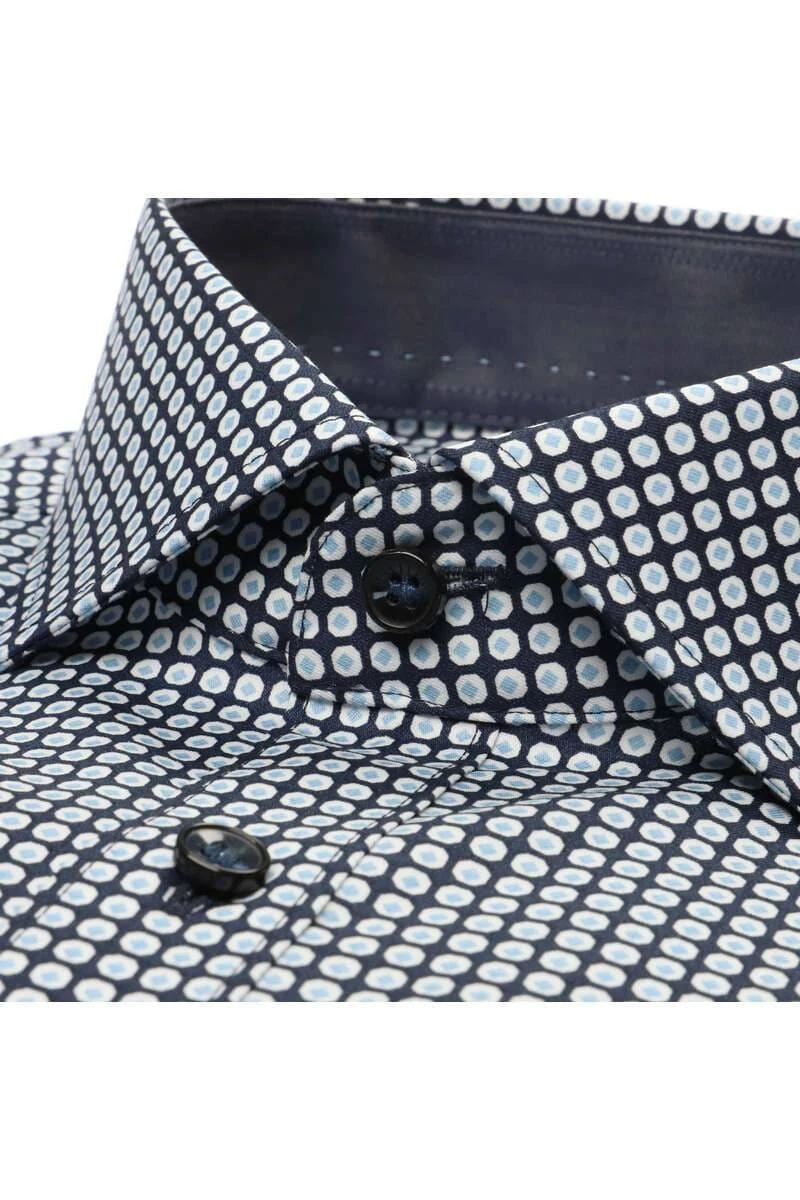 Das Hemd besitzt einen modernen Royal Kentkragen und ist bleu – Gemustert. Das taillierte, körperbetonte Business-Hemd mit natürlichen Comfort Stretch sorgt für uneingeschränkt hohen Tragekomfort und ist sehr formbeständig und Bügelleicht.